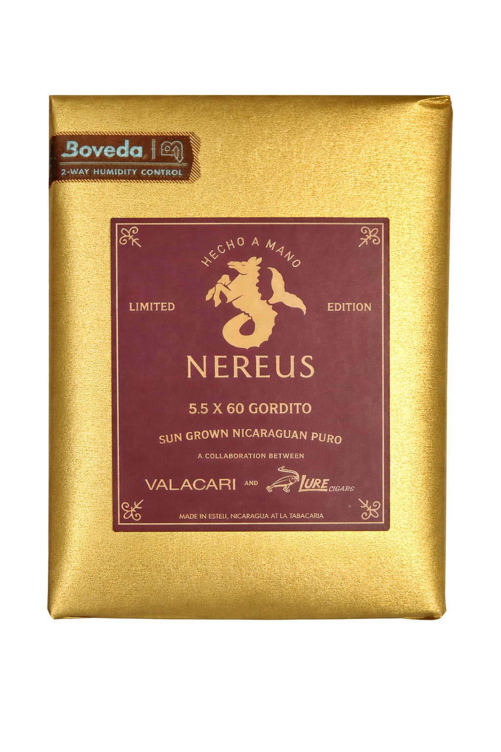 The Nereus is a 5 1/2 x 60 box-pressed gordito that is made entirely of Nicaraguan tobaccos. This includes a sun-grown habano-seed wrapper from Estelí, a binder from Estelí, and five-year-old fillers from Condega and Estelí. It is made at La Tabacaria Cigars in Estelí, Nicaragua. Notably, this is a different blend from The Redfish.